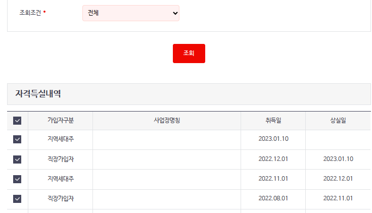 조회 후 자격득실내역에 그 동안 건강보험 가입 이력이 표시됩니다. 근무했던 모든 사업장과 지역가입내역까지 다 나타나는 것을 확인할 수 있습니다.