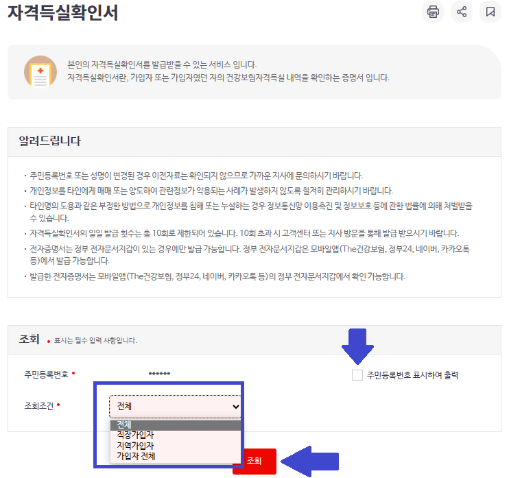 자격득실확인서 화면 아래 조회에서 조회조건을 선택, 주민등록번호 출력 여부에 체크하여 조회 버튼을 클릭합니다.