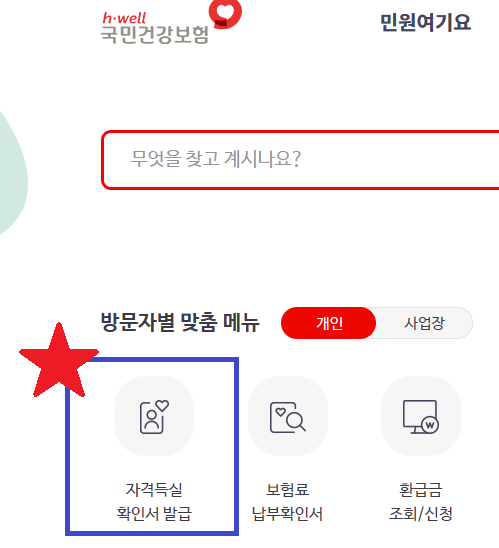 또는 방문자별 맞춤 메뉴에 첫번째 항목인 자격득실확인서 발급으로 들어갑니다.