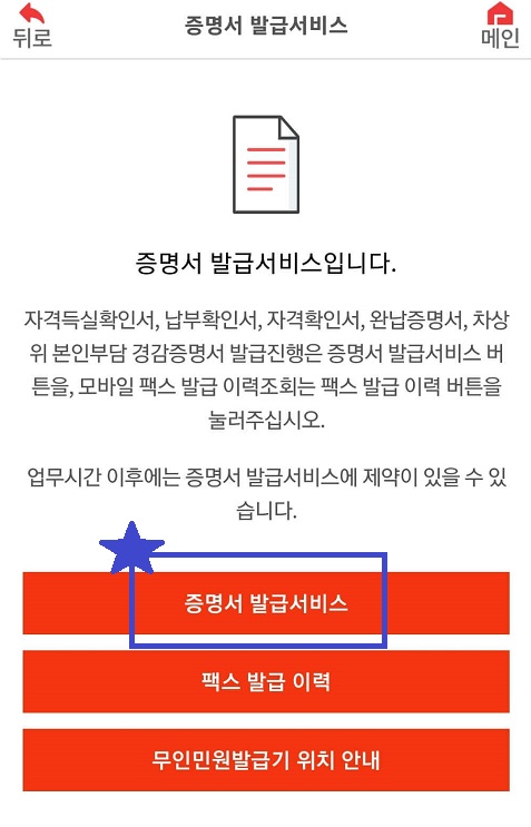 '증명서 발급서비스입니다'라는 문구 아래 증명서 발급서비스로 선택해 주세요.