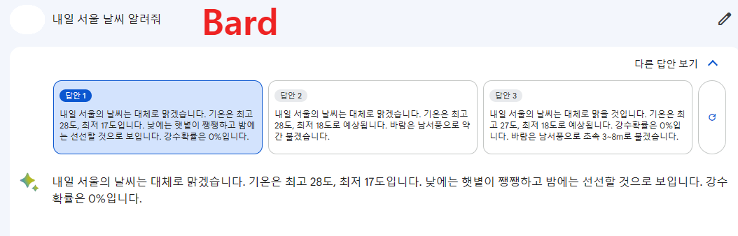 바드와 챗GPT와의 차이점을 알아보기 위해 같은 "내일 서울 날씨 알려줘"라는 공통적인 질문을 해보았습니다.