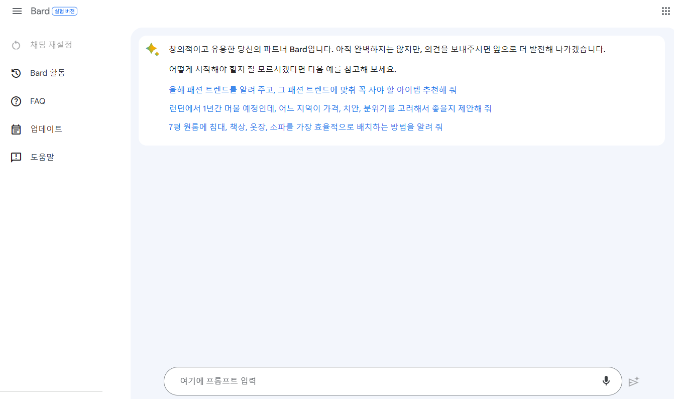 약관 및 개인 정보 보호 내역을 동의해 주시면 바드 실험 버전 화면으로 이동이 됩니다.