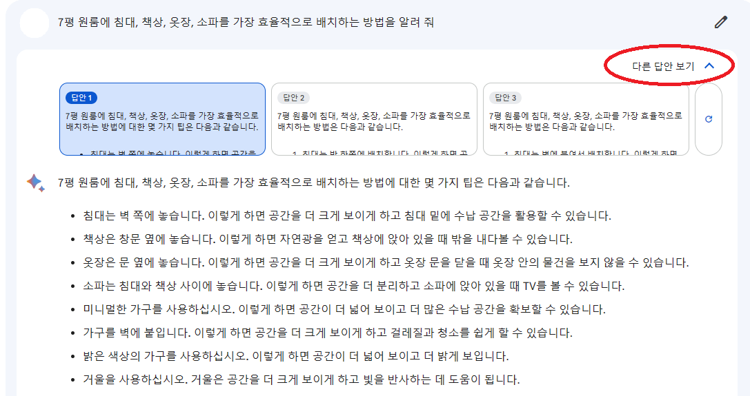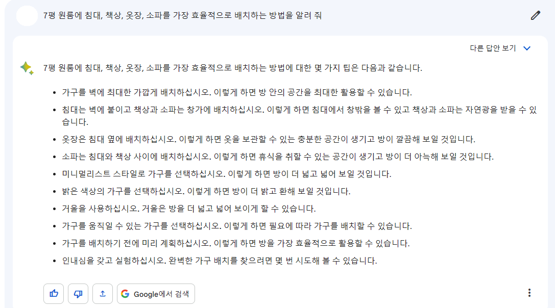 예시에 있는 "7평 원룸에 침대, 책상, 옷장 소파를 가장 효율적으로 배치하는 방법을 알려 줘"를 검색해 보았습니다.
