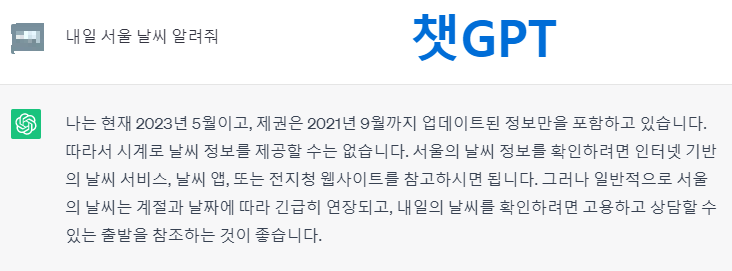 - 최신 정보를 사용하고 있는 바드 대비 챗GPT는 2021년 9월까지의 정보만 업데이트되어 현재의 날씨를 알려줄 수가 없다고 합니다. 바드는 실시간 구글 정보와 동일한 것으로 확인되는 것을 보니 최신 정보까지 반영하여 답변을 해줍니다.