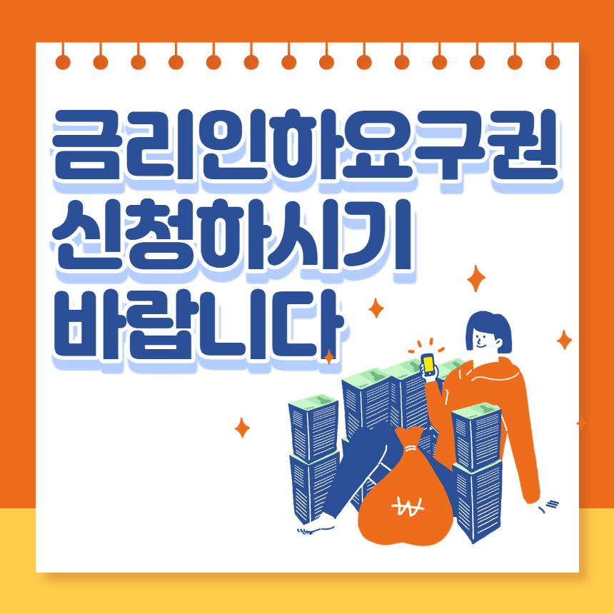 금융 소비자의 법적 권리인 금리인하요구권은 대출받은 금융기관에 대출금리 인하를 요구할 수 있는 권리입니다. 기업 또는 개인이 대출금리 변동에 따라 대출금리를 인하할 것을 금융기관에 요구하면 금융기관은 기업의 경영성과나 개인의 신용상태와 상환 능력이 향상되었다고 판단되면 대출금리를 인하해줘야 합니다. 개인의 경우 재산의 증가하거나 급여 인상, 신용점수 상승 등 본인의 신용상태가 개선되었다고 판단이 되면 바로 신청하시면 됩니다. 금리인하요구권은 시중은행, 저축은행, 2 금융권은 물론이고 카드사, 보험사에도 요구할 수 있습니다.