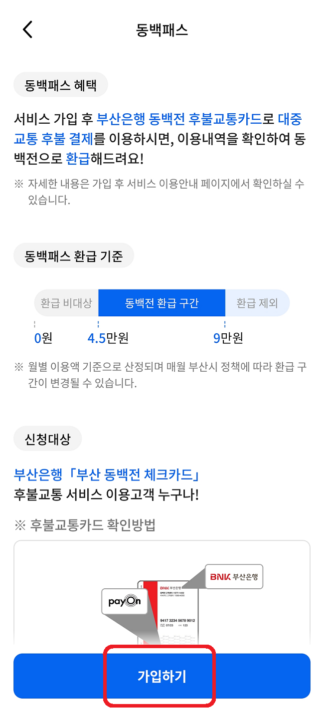 동백패스 환급금 혜택은 부산은행 동백전 후불교통 체크카드로 동백전 앱에서 동백패스를 등록하고 대중교통을 이용하는 경우에만 혜택을 받을 수 있습니다.
