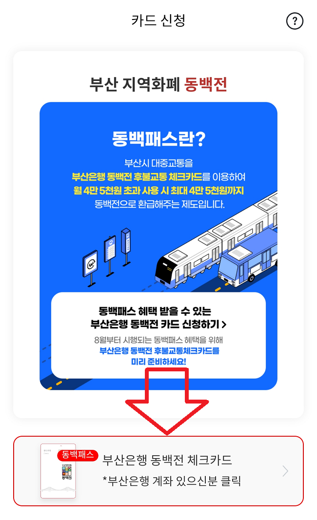 동백패스 신청대상은 부산시에서 대중교통을 이용하고 부산은행에서 동백전 체크카드 후불교통 서비스를 이용하는 국민이라면 누구나 신청 가능합니다.