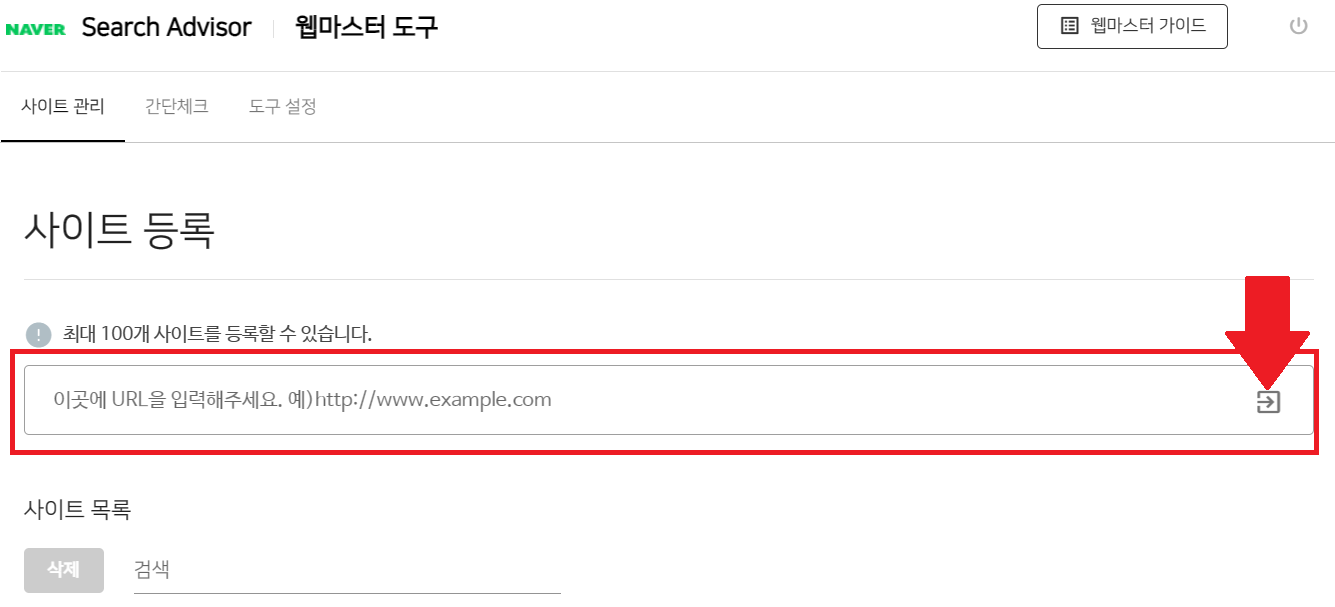 사이트 관리의 「사이트 등록」에서 본인의 블로그 도메인 주소를 입력합니다.