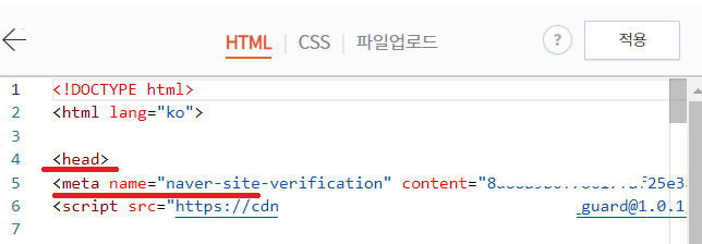 복사해 온 메타 태그를 <head> 아래 붙여 넣기 해 줍니다. 그리고 꼭 적용 버튼을 클릭해 주세요.