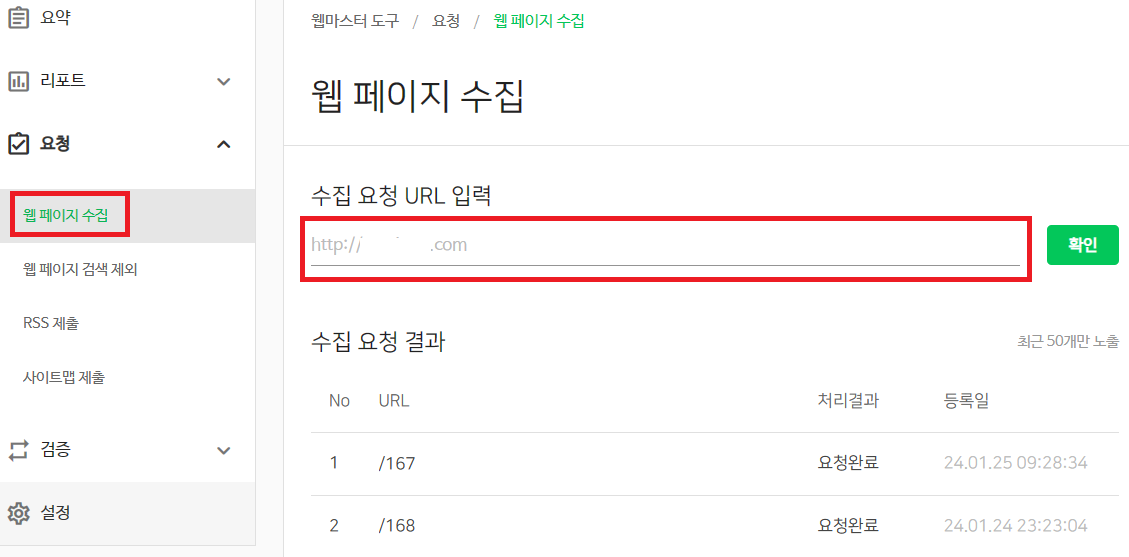 화면에 「요청」으로 들어가면 웹 페이지 수집에 수집 요청 URL 입력에 내가 포스팅한 블로그 주소를 넣어주면 됩니다.