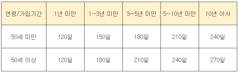 받을 수 있는 일수는 최저 120일, 최고 240일(50세 이상 및 장애인은 270일)입니다.