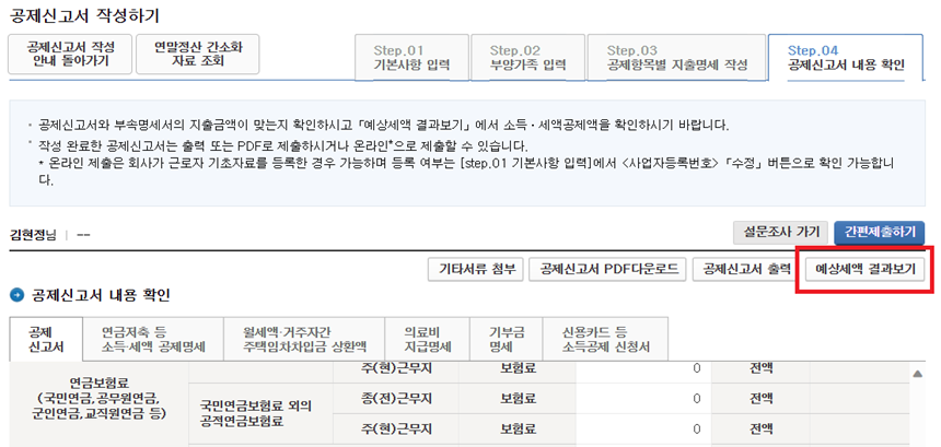 입력 후 위의 공제신고서 작성 순서대로 진행하여 예상세액을 확인할 수 있습니다.