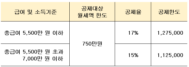○ 공제대상 월세액 한도는 750만 원이며, 총급여가 5,500만 원 이하이며 1,275,000원,