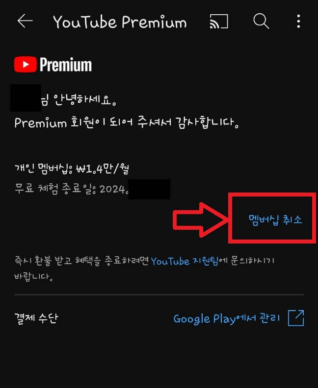유튜브 프리미엄 멤버십 결제는 Goole Play에서 취소 진행이 됩니다.