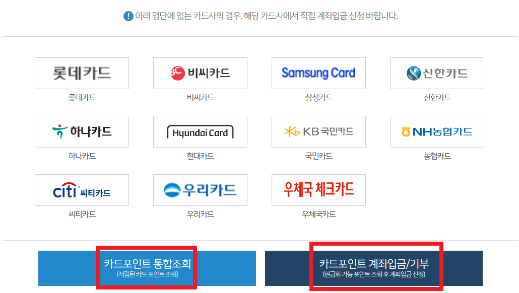 카드 사용 시 쌓이는 포인트, 사용기간이 지나 매년 1000억 원씩 소멸되고 있습니다. 누구나 한 장 이상씩 들고 있는 카드, 그 카드의 포인트를 현금화하여 내 통장으로 바로 입금받을 수 있습니다.  그냥 두면 사라지는 소중한 내 재산 카드포인트! 카드포인트 통합조회 서비스를 이용하여 간편하게 내 통장으로 입금 받아보시기 바랍니다. 목차 카드포인트 통합조회 서비스란카드포인트 통합조회는 카드를 사용하는 개인회원이 카드를 사용한 후 쌓여 있는 카드 포인트를 쉽게 조회하고 그 포인트를 일괄적으로 계좌입금을 신청할 수 있는 서비스입니다. 카드포인트 통합조회 이용 관련 안내● 카드포인트 통합조회 이용 가능 시간 : 매일 00:00~24:00시 이용 가능 ● 조회 가능한 카드포인트 정보 : 보유하고 있는 카드포인트의 잔액, 소멸예정 금액, 소멸예정일 ● 카드포인트 유효기간 : 보통 5년이나 카드사나 포인트 종류에 따라 1~3년 또는 무제한인 경우도 있음 ● 카드포인트 현금화 비율 : 1포인트당 1원으로 1포인트부터 계좌입금 신청 가능 카드포인트 계좌입금 처리 기한카드포인트 계좌입금 처리 기한은 카드사별로 상이합니다. ● 실시간 입금 처리 카드사 : 비씨카드, 신한카드, 우리카드, KB국민카드, NH농협카드 ● 실시간 및 다음날 입금 처리 병행 카드사 : 현대카드, 하나카드 ● 다음날 입금 처리 카드사 : 삼성카드, 씨티카드, 우체국, 롯데카드 카드포인트 통합조회 서비스 이용하기인터넷에 카드포인트 통합서비스(cardpoint.or.kr))를 검색 후 사이트를 클릭합니다. 통합조회/계좌입금/기부 바로가기로 들어갑니다.  로그인 화면이 나오면 회원가입 또는 비회원조회하기 둘 중 편하신 방법으로 진행하시면 됩니다. 비회원조회도 카드포인트 조회 후 계좌입금 서비스까지 이용이 가능합니다. 카드 포인트 통합조회 계좌입금 서비스에 대한 위임 동의를 체크 후 다음을 클릭하세요.  화면에 보이는 카드사만 카드포인트 계좌입금이 가능합니다. 카드포인트 조회만 할 경우 카드포인트 통합조회 클릭 카드포인트 조회 후 계좌입금을 받을 경우 카드포인트 계좌입금/기부를 클릭합니다.  카드포인트 계좌입금/기부를 조회하면 카드사별로 포인트가 조회되어 계좌입금 요청을 할 수 있습니다. 혹시 내 포인트를 좋은 일에 쓰고자 한다면 포이트 기부 바로가기로 진행하면 됩니다.  포인트를 입금받을 은행과 계좌번호를 넣고 인증을 진행합니다.  인증이 되면 계좌인증에 성공하였다고 아래와 같은 팝업이 뜨고 신청 결과를 확인할 수 있습니다.   실시간으로 입금처리되는 KB국민카드는 신청 결과 확인 동시에 통장 입금이 되는 걸 확인할 수 있습니다.  '생활정보' 카테고리의 다른 글여름 필수 아이템 썸머패치(모기패치), 모기약 추천 (0) 2023.06.30 원터치 모기장 침대 모기장 야외 모기장 추천 BEST 3 (0) 2023.06.29 인스타그램 비활성화 방법 인스타그램 비활성화 해제 (모바일, PC) (0) 2023.06.27 무인민원발급기 시간 위치 발급 가능 서류 (등본, 가족관계증명서 외) (0) 2023.06.23 건강보험자격득실확인서 발급방법 즉시 출력(PC, 팩스, 무인발급기) (0) 2023.06.22