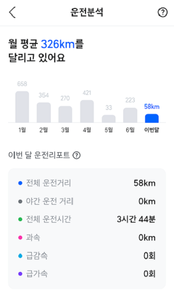 티맵 운전분석에 월평균 주행 거리와 운전리포트를 통해 본인의 운전 습관 등 을 확인 할 수 있습니다.