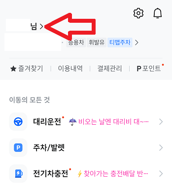 티맵 화면 하단 오른쪽 '전체' → 상단 계정 정보 클릭