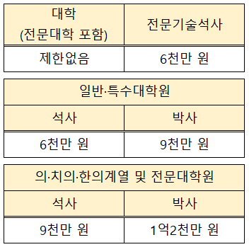 - 학사학위과정과 석사학위의 통합 과정의 경우 석사 한도를 적용합니다.