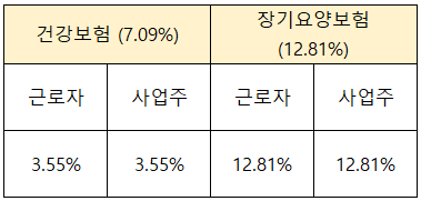 국민연금, 건강보험(장기요야 보험 포함)은 사업주와 근로자가 반반씩 부담을 합니다.