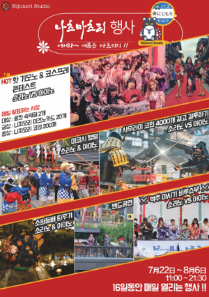 올해 두 번째로 열리는 나츠마츠리는 니지모리스튜디오에서 즐기는 여름축제입니다. 니지모리스튜디오는 일본 감성 테마파크입니다. 작년에 2만 명 이상의 방문객이 다녀갔고 국내 데이트코스로도 추천되었다고 합니다.