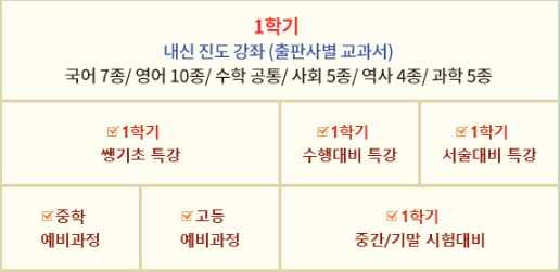 1, 2학기 시기별 커리큘럼을 제공하여 효과적인 학습 방법으로 내신 시험을 대비할 수 있습니다.